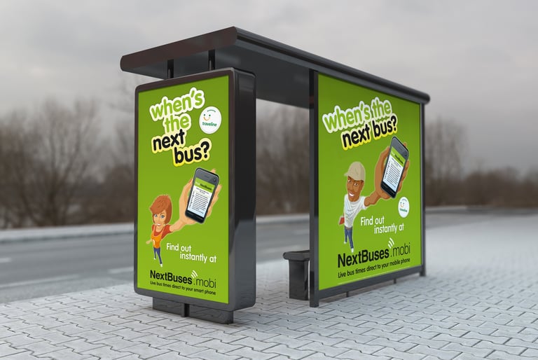 NextBuses.mobi is a mobile-optimised website, launched by Traveline in 2011. We were tasked with creating a youth-oriented advertising and awareness campaign to promote the service. Across targeted advertising mediums including Adshels and on-bus advertising, Traveline promoted the service with a fun, accessible illustrative design style and punchy messaging.